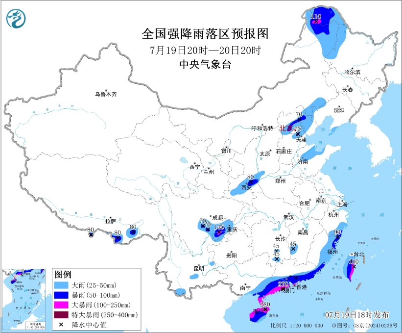 央视网消息:中央气象台7月19日18时发布暴雨黄色预警:预计,7月19日20时至20日20时,海南岛、广东中南部、广西东南部、福建东部、浙江南部、江西西南部、湖南南部、台湾岛大部以及内蒙古东部、黑龙江西部、陕西南部、山西西南部、河北北部、北京中北部、天津中北部、山东北部、辽宁西部和东南部、四川盆地南部、重庆西南部、西藏东南部等地有大到暴雨,其中,广东西南部、海南岛北部、内蒙古东北部、四川盆地南部、台湾岛东部等地的部分地区有大暴雨,广东西南部沿海、海南岛东北部等地局地有特大暴雨(250~280毫米)。上述部分地区伴有短时强降水(最大小时降雨量20~50毫米,华南沿海局地可超过80毫米),局地有雷暴大风等强对流天气。